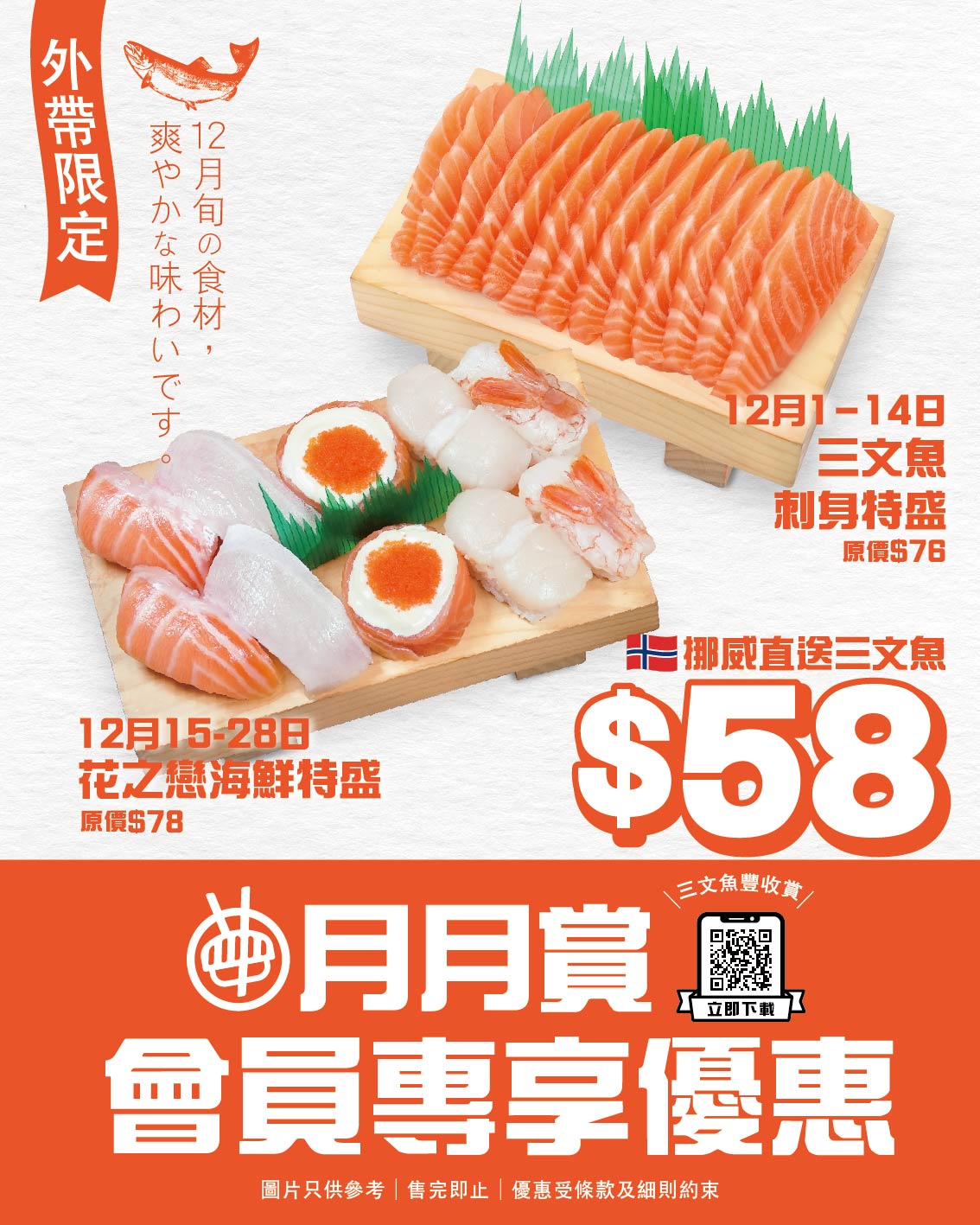 會員專屬嘅「月月賞」又嚟啦,人氣三文魚再度登場~12月期間,無論迴轉定外帶,星級滋味一次享盡,為大家帶嚟經典同創新口味,記得把握機會嚟感受鮮味爆發同暖心滋味啦~
